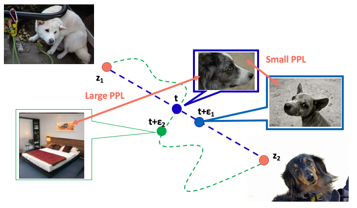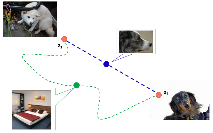우리가 하얀 개를 생산하는 잠재 변수인 z1과 검정 개를 생산하는 잠재 변수 z2가 있다고 생각해 보자. 색깔 이외의 다른 요소는 바뀌지 않았으므로 중간의 데이터의 잠재 변수는 흰색과 검은색 사이의 경로에 따라 바뀌는 게 이상적이다. 즉 회색 개가 나오는 게 목표라고 할 수 있다. 다시 말해 색만 바뀌는 파란색 경로는 "지각적으로(perceptually)" 가장 짧은 거리이다. 반대로 객체의 모양을 바꾸고 침대와 같은 이미지를 통과하는 초록색 경로는 "지각적으로(perceptually)" 거리가 멀다.