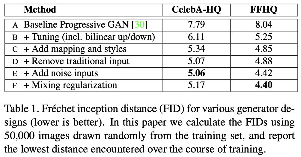 FID 점수는 고정된 값 텐서(fixed value tensor)로 이미지를 생성, Mapping network에 의한 스타일 도입 그리고 후술 할 혼합 정규화(mixing regularization)에 의해 개선되었다.
