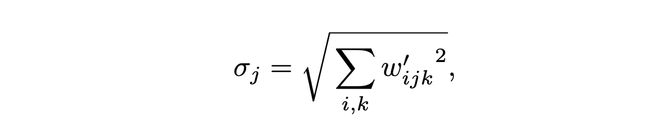 여기서 원하는 작업은 표준 편차의 역수로 출력을 곱하는 것이다. 가중치 w_ijk와 합성곱(convolution)의 곱셉에 표준 편차의 역수를 곱한 작업은 표준 편차의 역수에 곱한 가중치 w_ijk와 합성곱(convolution)하는 것과 같다. 따라서, 이 정규화(normalization) 작업은 다음과 같이 수행된다. ((d)의 Demod)