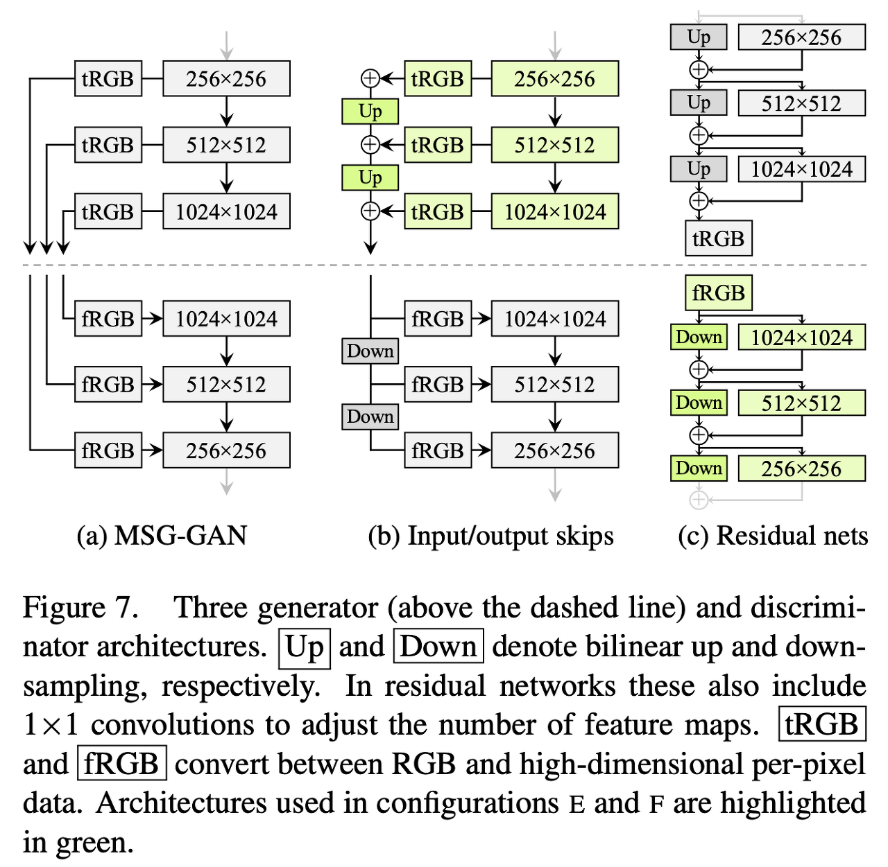 그러므로 저자는 Progressdive Growing을 사용하지 않는 고해상도 이미지 생성 방법을 제안했다. 네트워크는 MSG-GAN과 비슷하다. 아래 그림은 후보들이다.