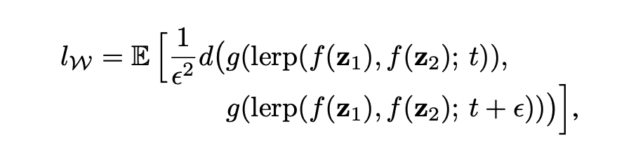 이제 잠재 공간의 지각적 매끄러움(perceputal smoothness)을 나타내는 PPL과 이미지 품질 사이에 상관관계가 있을 수 있다는 것을 알아냈기 때문에 우리는 이를 regularization term으로 통합하겠다. 수식은 다음과 같다. a는 상수고 y는 정규 분포로부터 생성된 랜덤 이미지이다.